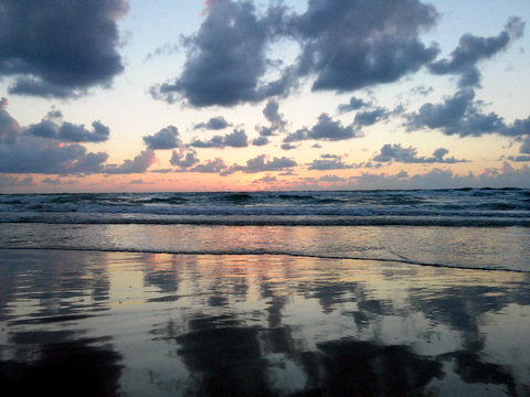 волны смывают отражение неба на мокром песке