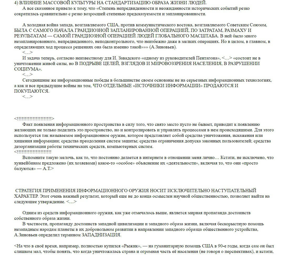 В чём смысл информационной войны? Противник имеет достаточно ресурсов, энергетических, экономических, военных, человеческих и прочих, чтобы самому обеспечить своё уничтожение. Вкладывать в информационную войну надо очень немного. Противника в принципе всегда можно обмануть так, что свои ресурсы он направит против себя самого САМ. Что и происходит.