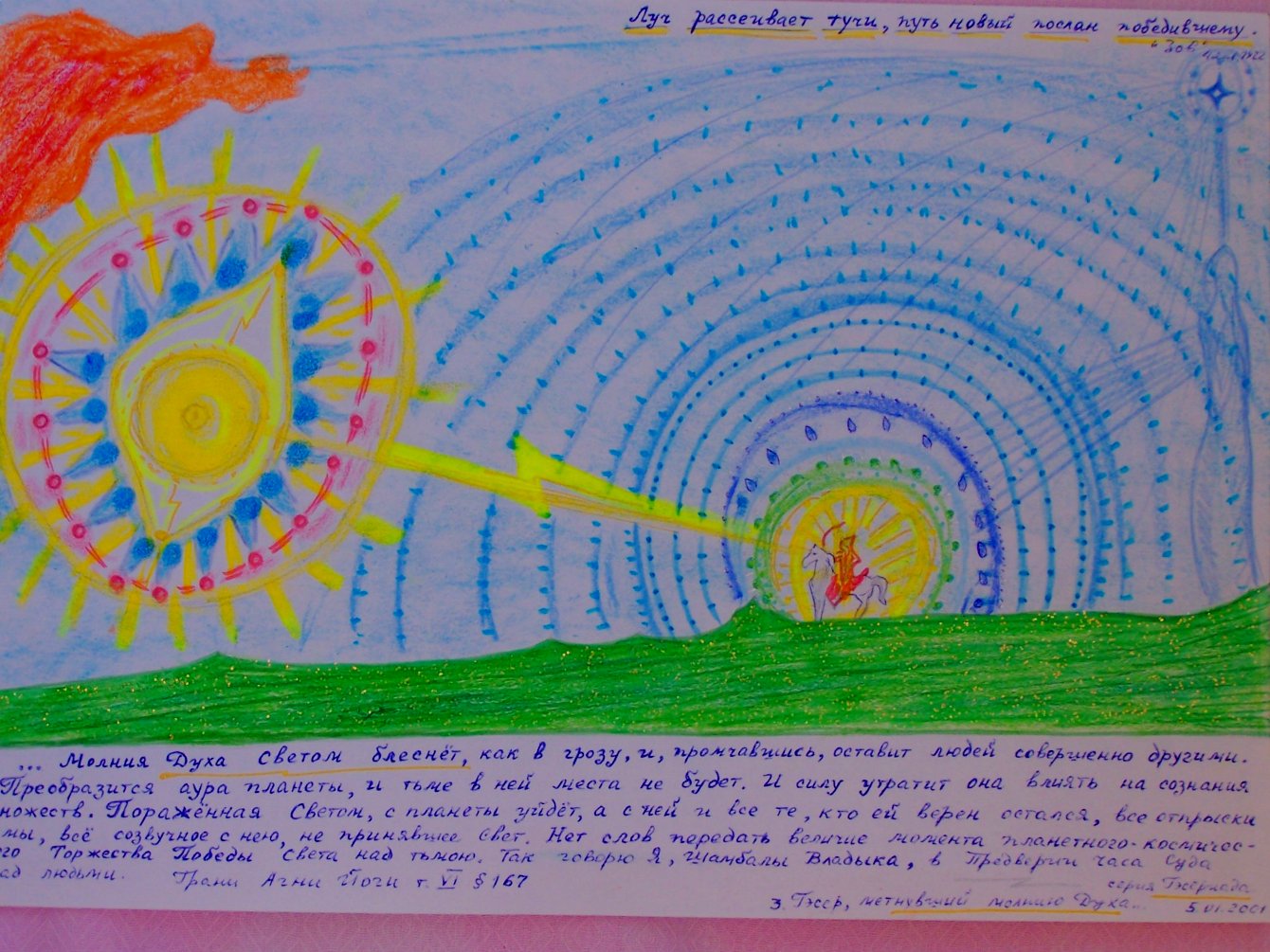 «… Молния Духа Светом блеснёт, как в грозу, и, промчавшись, оставит людей совершено другими. Преобразится аура планеты, и тьме в ней места не будет. И силу утратит она влиять на сознания множеств. Поражённая Светом, с планеты уйдёт, а с ней и все те, кто ей верен остался, все отпрыски тьмы, всё созвучное с нею, не принявшее Свет. Нет слов передать величие момента планетного-космического Торжества Победы Света над тьмою. Так говорю Я, Шамбалы Владыка, в Предверии Часа Суда над людьми… » Грани Агни Йоги том 6 параграф 167. (из записей Бориса Абрамова ученика Н.К. Рериха)