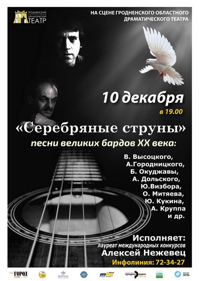 10 декабря 2016 года в малом зале областного драматического театра города Гродно (Беларусь) состоится сольный концерт лауреата международных конкурсов Алексея Нежевца (г.Минск). Вашему вниманию будут представлены песни великих бардов ХХ века: В.Высоцкого, А.Городницкого, Б.Окуджавы, А.Дольского, Ю.Визбора, О.Митяева, Ю.Кукина, А.Круппа и др.