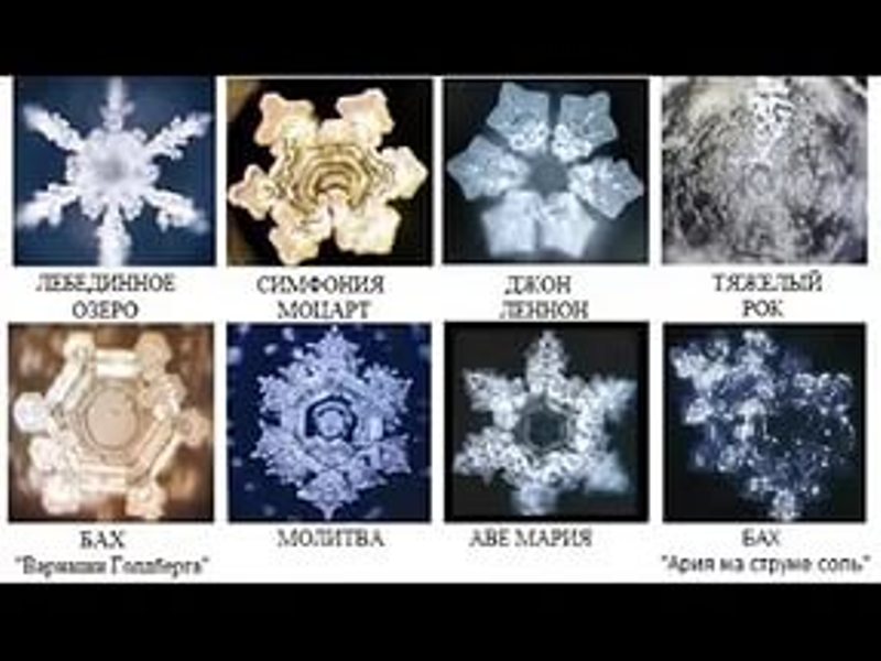 А вот например из книги особенно запомнилось: фотография кристалла воды совершенной симметричности и красоты после того, как воде дали прослушать песню Пола Маккартни "Yesterday". Автор высказывает мысль, этим и объясняется возможно популярность этой песни во всем мире. Очень возможно.. Кстати, клетка состоит на 80% из воды. Также красивы были кристаллы на песни Элвиса Пресли. Вся классика. Кристаллы после прочтения молитв.