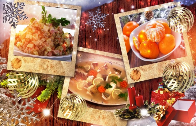 Мандарины, "Оливье", заливная рыба,