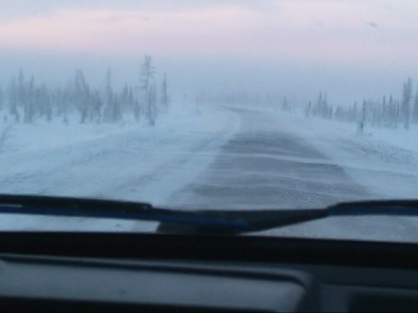По заиндевелой трассе.