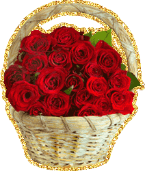 Держа в руке корзину алых роз.