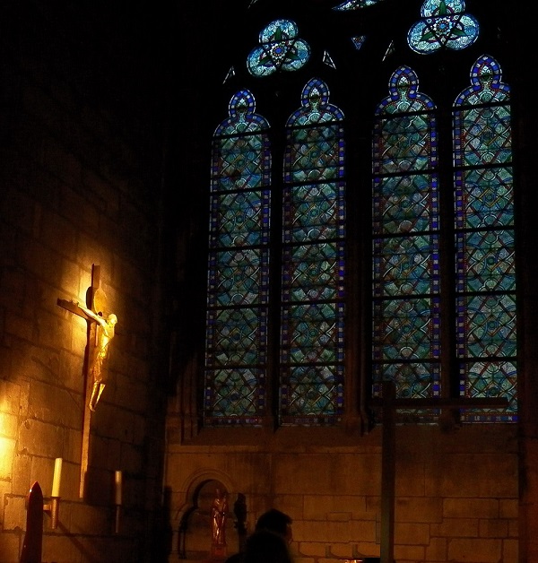 Единственный прожектор как тусклый солнечный луч освещал алтарную площадь, витражи и фигуру Христа, распятого на кресте.