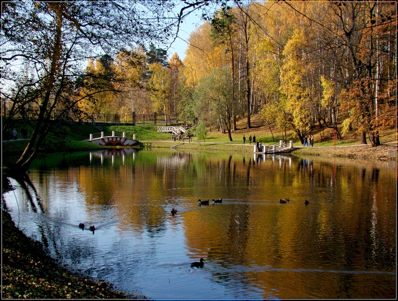 Аллею и уток, плывущих лениво.