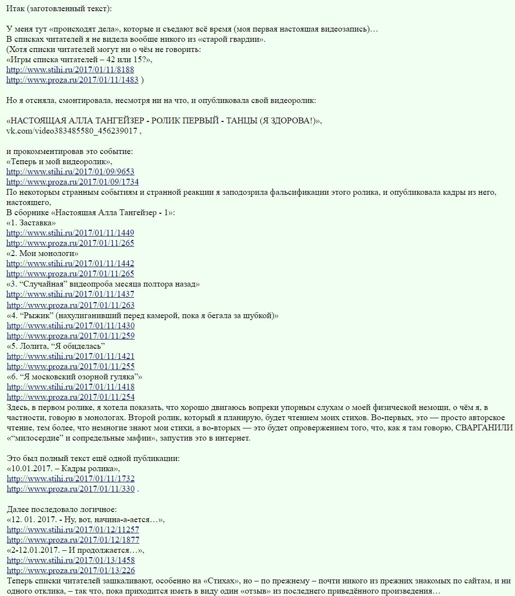 Но, главным образом, речь идёт о моём видеоролике, о котором ВСЕ МОЛЧАТ. Одно из двух: или я в нём, реальная, слишком не соответствую тому, что из меня ДЕЛАЮТ (на ГОСУДАРСТВЕННОМ, похоже, уровне), и изо всех сил «кому-то» надо создать впечатление, что этой видеозаписи не существует, — или там всем пользователям представлена фальсификация, о которой все «боятся» заговорить.