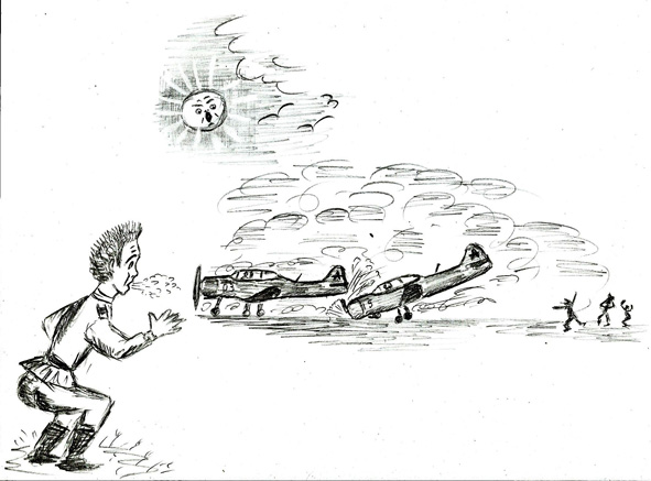 Самолёты отрулили примерно метров за пятьсот от основной стоянки, остановились, развернулись друг другу навстречу, помедлили и ринулись друг на друга лоб в лоб! Это было жутко видеть! Перед, казалось бы, неминуемым столкновением они чуть - чуть притормозили, отворачиваясь и промчались друг мимо друга, вскользь ударившись консолями, но тут же развернулись, сильно юзя на 180 градусов и опять ринулись друг к другу, но сильно разворачиваясь в движении, пытаясь подойти друг к другу сбоку или сзади и потому закружились в вальсе, скрываясь в пыли. Слышно было, что они сбросили газ, ожидая, когда осядет пыль, потому что потеряли друг друга из виду. Едва осела пыль, как взревели двигатели и опять пошло кружево вальса, но они сообразили, едва их накрывало облако пыли, они стали вырываться из него, чтобы продолжить это наземное самолётное побоище. Вдруг мы видим, в очередной раз они выскакивают из облака пыли, один за другим и задний, доворачиваясь в стремительном движении, рубит винтом хвост другому!.. Брызги осколков! Но летит и кусок винта – одна лопасть таранившего самолёта, а он продолжая двигаться, очень сильно подпрыгивал на передней стойке от бешеной вибрации и по мере замедления вращения, всё выше и выше, пока стойка не рухнула и самолёт, едва не скапотировав (не перевернувшись на кабину) ткнулся носом в землю и всё стихло.