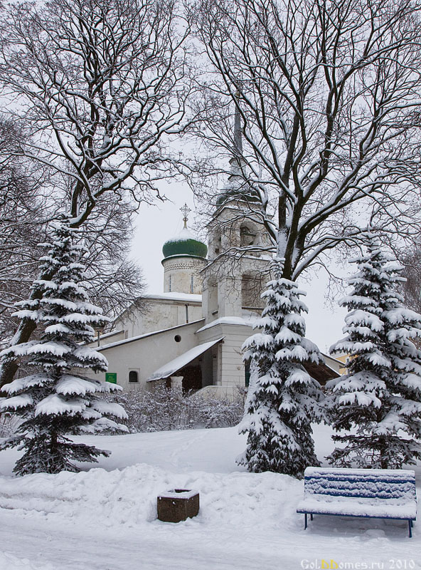 Имя Анастасии в церквях Пскова повторялось. Стояла еще одна небольшая изящная часовенка возле самого Ольгинского моста через реку Великую. Построили ее в 1911 году по проекту известного русского архитектора Алексея Щусева. Приглянулась она мне не за особую красоту и ее размеры. Она скромна и незаметна среди современных городских построек. У нее маленькая, похожая на падающую капельку главка и орнамент на стенах. Творение русского серебряного века, тактичная стилизация под древний псковский стиль. Ее сомкнутые своды изнутри украсили росписи Григория Чирикова, сделанные по эскизам знаменитого художника Николая Рериха.