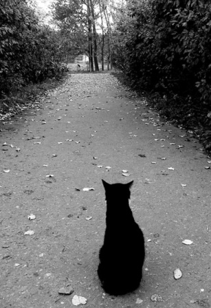 Идём мы с ним недавно по своему каждодневному маршруту, идём по дорожке между домами и вдруг, откуда ни возьмись кошка, причём чёрная. Медленно так вышла на дорожку, посмотрела на нас и спокойно села посредине дорожки. Мой пёс остановился метрах в десяти от кошки и замер. Потом опустил хвост, постоял несколько секунд и развернулся обратно. Весь вид его говорил: "Нет уж, себе дороже туда идти!"