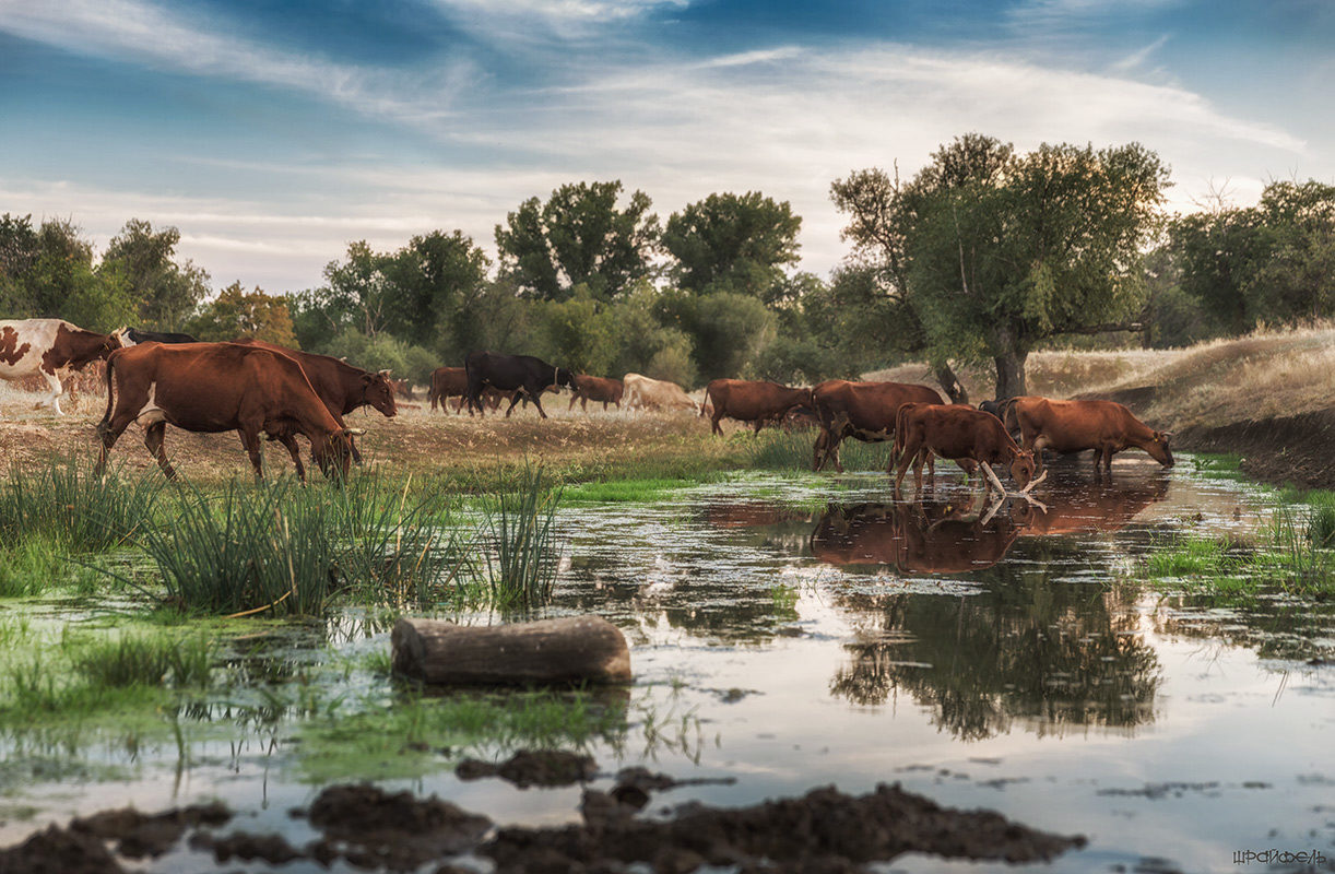 Стадо гонит пастух к водопою-