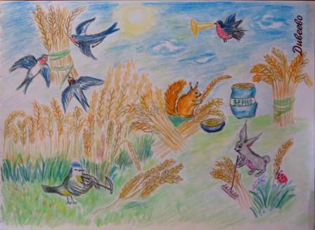Зайчик колоски собирает,