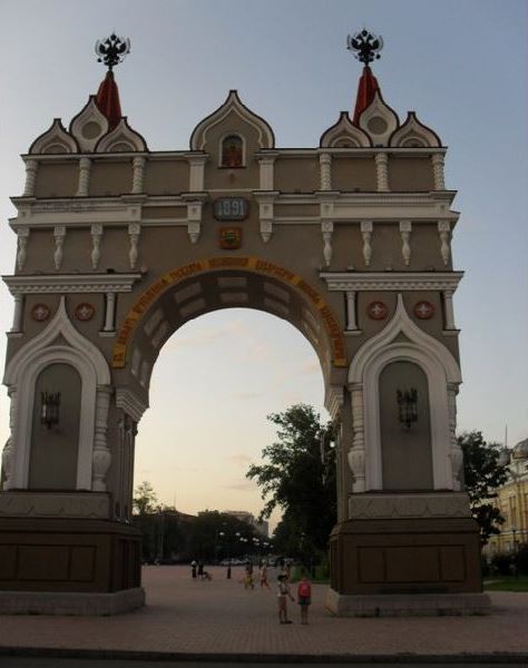 * На своде Триумфальной арки установлены две керамические иконы: икона Благовещения Пресвятой Богородицы смотрит на амурскую столицу, а лик Николая Страстотерпца обращен к Китаю.