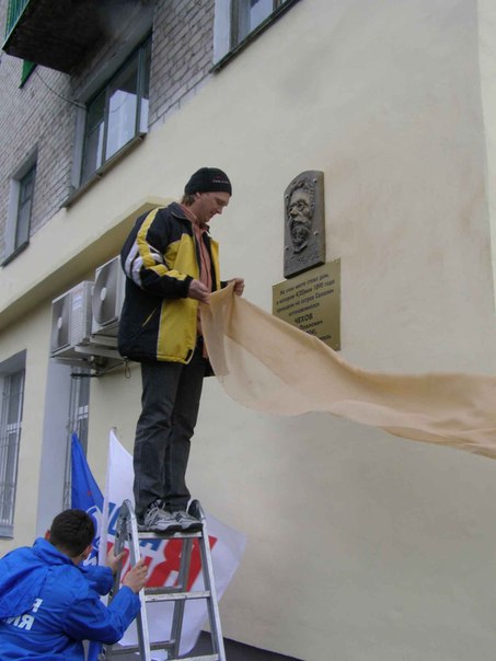 На снимке: За мгновение до открытия рельефа "А.П.Чехов" в г. Ишиме на фасаде дома №9 по ул. К.Маркса. Автор рельефа художник Дмитрий Новаков.