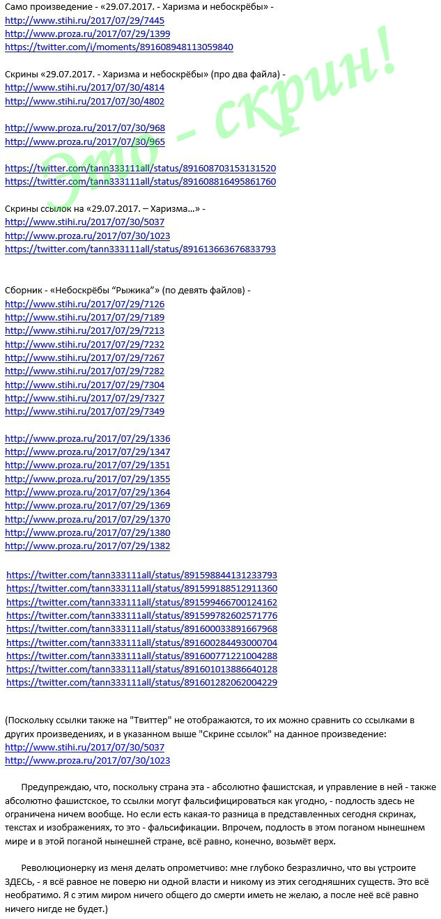 Предупреждаю, что, поскольку страна эта - абсолютно фашистская, и управление в ней - также абсолютно фашистское, то ссылки могут фальсифицироваться как угодно, - подлость здесь не ограничена ничем вообще. Но если есть какая-то разница в представленных сегодня скринах, текстах и изображениях, то это - фальсификации. Впрочем, подлость в этом поганом нынешнем мире и в этой поганой нынешней стране, всё равно, конечно, возьмёт верх.