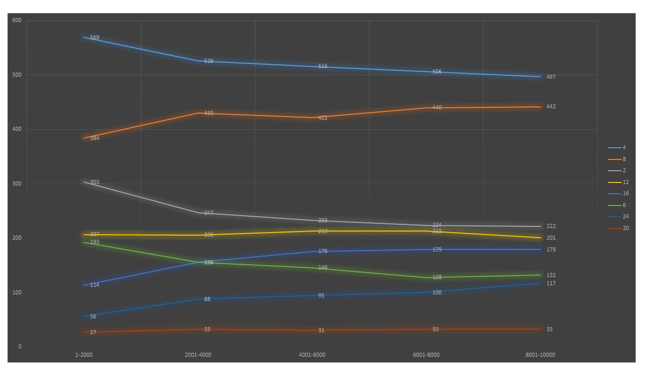 Условные обозначения - количество определённого числа делителей на отрезках (или в группах).