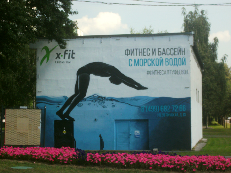 Это — самая натуральная РЕКЛАМА. (Реклама фитнес-центра.) Располагается она на какой-то огромной трансформаторной будке (или на чём-то в таком духе) на центральном бульваре Череповецкой улицы, от пл. Лианозово — к м. Алтуфьево. (В обратную сторону можно пройти мимо, если не оглядываться назад.)