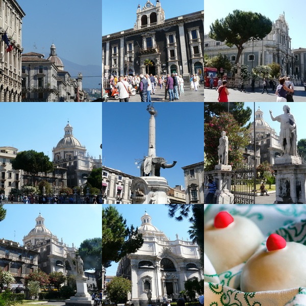 По прямым улицам Катании, в конце которых видна Этна, мимо Коллегиальной базилики в стиле сицилианского барокко выходим на Соборную площадь, которая представляет собой единый барочный архитектурный ансамбль.