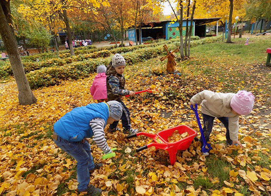 Спешат ярких листьев набрать.
