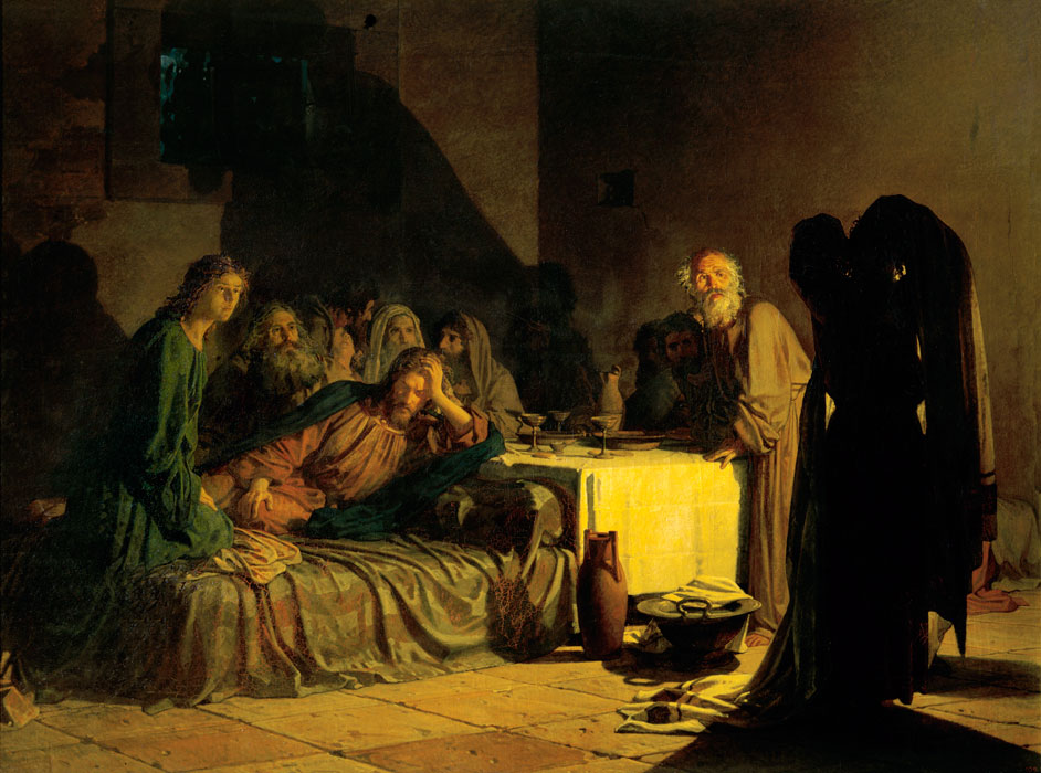как бы миновали - с Иудой, собственно, все кончено - он неторопливо уходит в темноту, художник не занимается облучением неверного. Ге сосредотачивает внимание не на драматизма разногласий, даже не на психологической трактовке персонажей, а