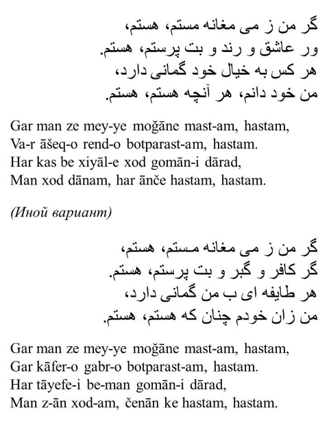 Возможно, именно второй вариант четверостишия и был перед глазами Г.Б. Плисецкого. Интересно, однако, что ни в одном из вариантов нет противопоставления. Всё множество мнений о себе принимается Омаром Хайямом как истинное: если я есмь я, то всё, что я есмь, я есмь. Поэт абсолютно искренен, и эта безграничная искренность является величайшей (вернее сказать – мистической) загадкой Омара Хайяма.