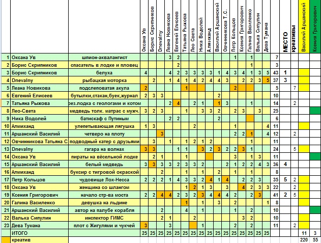 За 2 кретива – получают 50 баллов несколько авторов: ТАТЬЯНА РЫЖОВА(№7) о геологах и коте, ВАСИЛИЙ АРШАНСКИЙ(№11) о четверых, что ищут Землю Санникова, ПЕТР КОЛЬЦОВ(№17) о Лохнесском чудовище, ОКСАНА УВ(№18) о женщине устроившей потоп и ДЕВА ТУМАНА(№23) о чукче с Жигулями;
