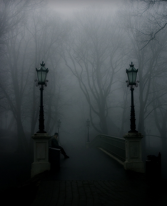Дым тумана осеннего скрыл под покровом город.
