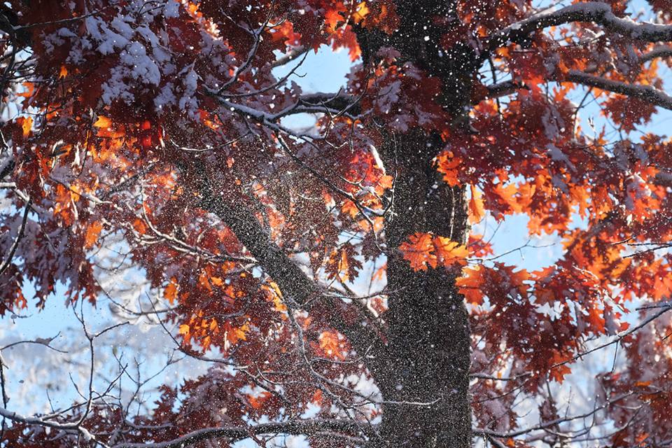 Утром была зима, окружающий мир белел в лучах утреннего солнца, лишь местами скромно проглядывали жёлтые и красные огоньки. Солнце поднималось выше, тепло проникало в зиму и пришла весна, с мартовской капелью, а снег осыпался вместе с листьями, сказочное зрелище. В течение часа всё растаяло и весна сменилась.. осенью.