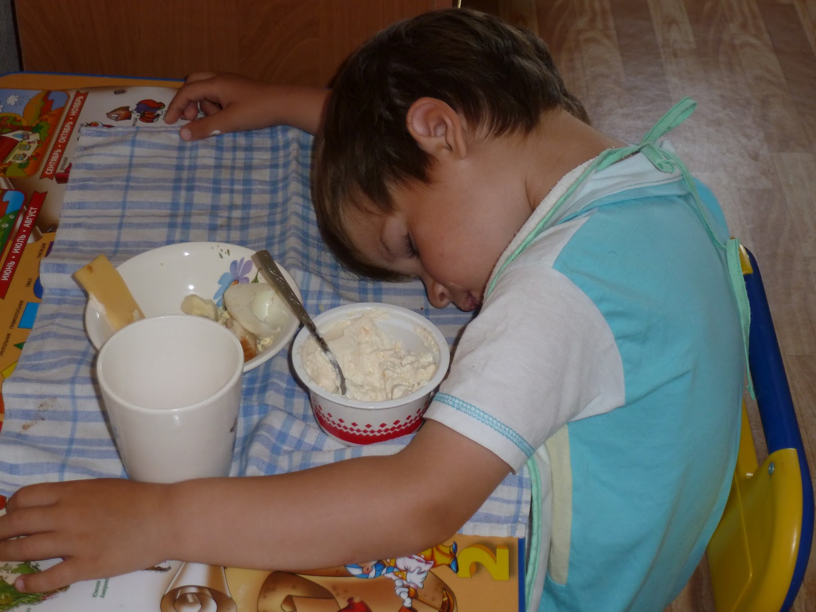 За столом свалился.