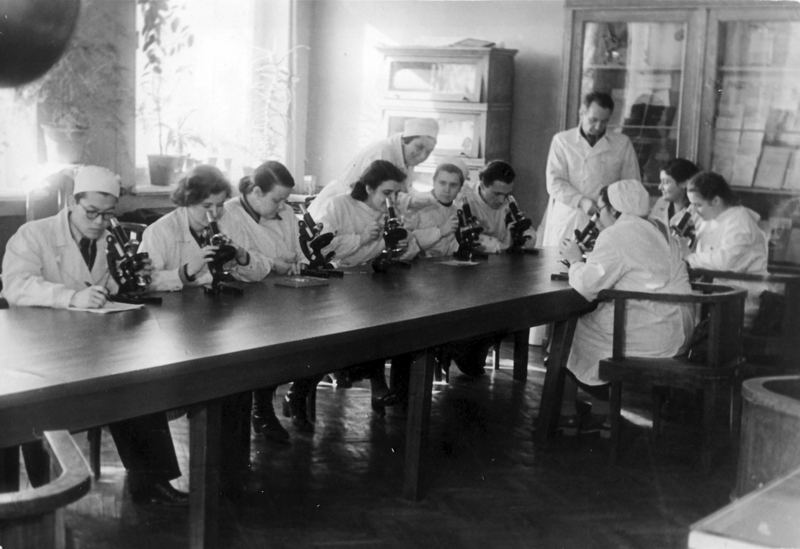 (Фото из газеты 1-го МОЛМИ «За медицинские кадры» №26-27 за 30 июня 1951 года с подписью: "Профессор А.И. Струков и доцент И.А. Авдеева ведут занятия с шестикурсниками на кафедре патологической анатомии"