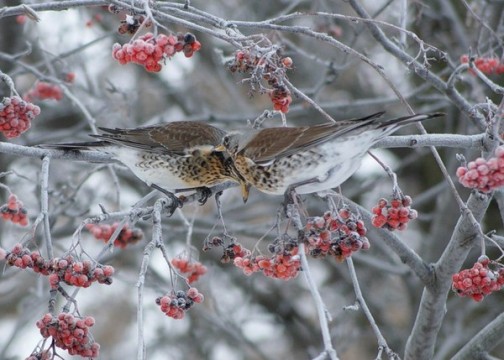 Дрозды клюют мороженые гроздья,
