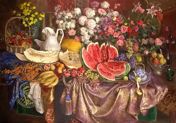 Картину "Цветы и фрукты" художник писал в двухкомнатной квартирке на Каширке в 1994 г. Это теперь у него есть мастерская, а тогда ещё не было. Все эти фрукты, которые служили натурой, имели свойство портиться и терять свой вид, летали мухи над этим сладким раем, приходилось заново обновлять натуру. Сочный спелый арбуз до того настоящий, что так и хотелось его попробовать!