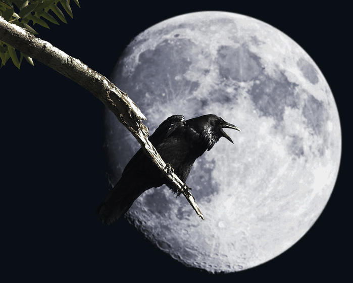 А ворона каркает, сидя на суку.
