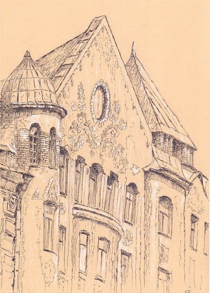 Сам термин “северный модерн” появился значительно позже, уже в советский период, чтобы обозначить этот необычный романтический архитектурный стиль, заставлявший вспоминать о суровых скальных ландшафтах и западноевропейских средневековых замках. Такие дома прежде уже встречались мне в Стокгольме и Хельсинки и показались удачно вписанными в сдержанную по краскам северную природу. Когда-то этот стиль в России критиковали, называли его “чухонским модерном”, противопоставляли национальному “имперскому” стилю Петербурга. А еще этот дом по своему фасаду щедро украшен майоликовыми вставками, декоративными панно, выполненных в мастерских известного тогда художника-керамиста Петра Кузьмича Ваулина.
