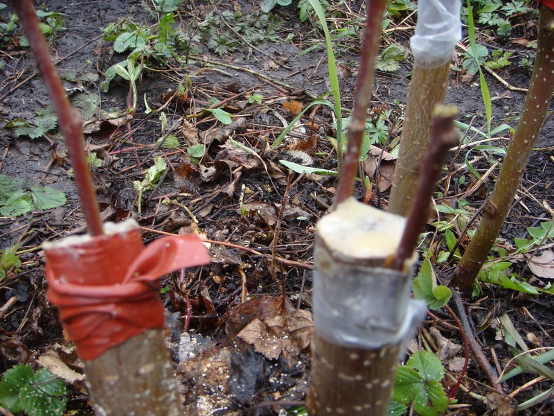 Правая прививка на фото, прижилась одним побегом. В этом году были неблагоприятные условия: поздняя весна с длинными заморозками, градом, дождями... В позапрошлом году прижились четыре и пошли в рост.