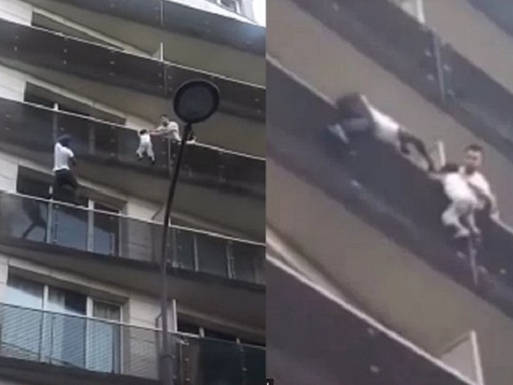 Пролез за ребёнком, висящем на балке,
