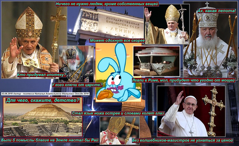 Прост словарь терминологий, в нём бесчислен список слов. В загрязнённом водоёме отвратителен улов, хоть красива с виду рыба и приятный аромат. Тьма учёных, книжек глыба, а какой-то Герострат хочет сжечь библиотеку, чтоб деревья не рубить. Кто придумал ипотеку? Есть зависимости нить в том, чтоб жить под крышей в доме, где из труб выходит дым. Человек лежащий в коме только кажется простым, на него уходят силы, много денег и лекарств. У кого ключи от виллы? У кого ключи от царств? Если люди старше взглядом есть и пить не захотят, то, пожалуй, казнокрадам этим вряд ли навредят. Чтоб коням облегчить ношу, скиньте с воза баб с детьми. Уподобясь пузом Крошу, называются людьми те, кто в митрах сел на троне в длинной рясе с булавой поболтать о евро-кроне, сотрясая головой.