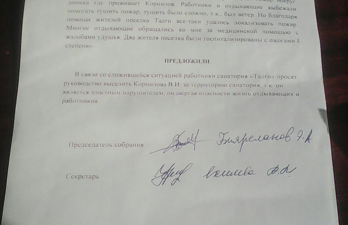 руководство выселить Корнилова В.И. за территорию санатория, т.к. он является злостным нарушителем, подвергая опасности жизнь отдыхающих и работников."