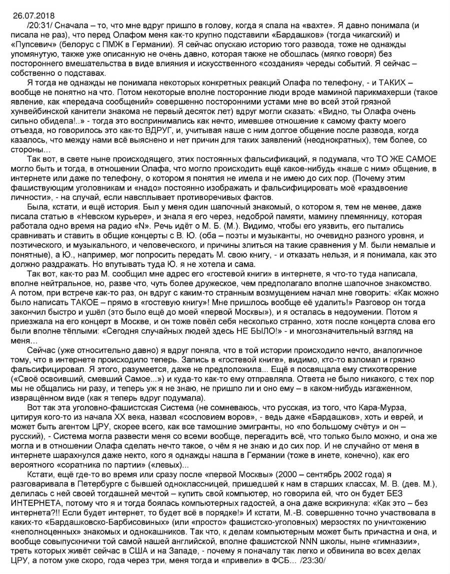 Так вот, в свете ныне происходящего, этих постоянных фальсификаций, я подумала, что ТО ЖЕ САМОЕ могло быть и тогда, в отношении Олафа, что могло происходить ещё какое-нибудь «наше с ним» общение, в интернете или даже по телефону, о котором я понятия не имела и не имею до сих пор. (Почему этим фашиствующим уголовникам и «надо» постоянно изображать и фальсифицировать моё «раздвоение личности», - на случай, если навсплывает противоречивых фактов.