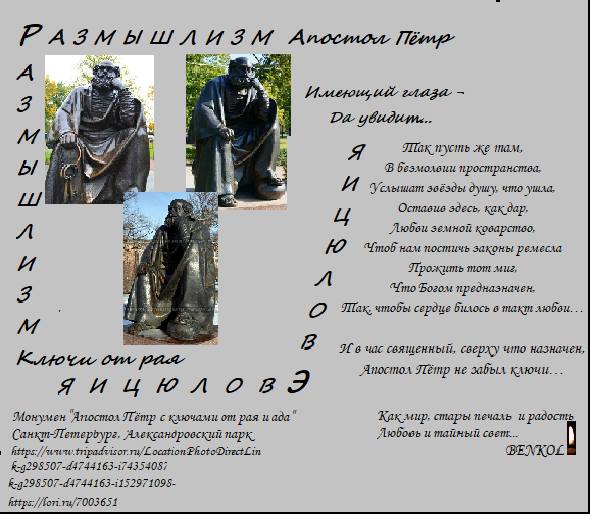 P.S. В Санкт-Петербурге, в Алекандровском саду, что возле Пертопавловки, у скульптурного апостола Петра сначала украли-срезали ключи о рая и ада, оставив одну дужку, а потом, чтоб народ не смущать, и дужку срезали...