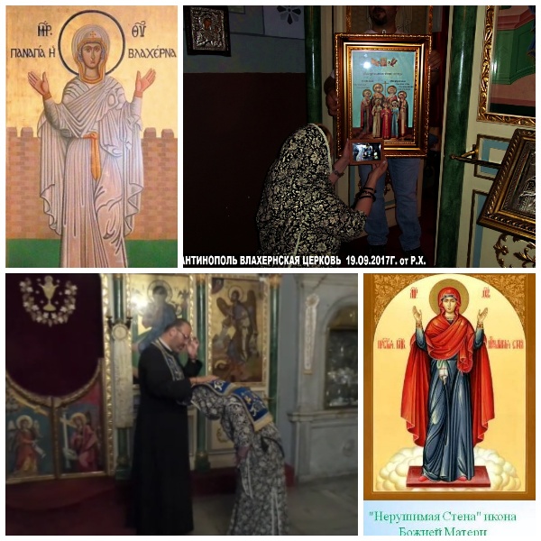 * Во Влахернском храме есть две иконы с одинаковым названием. Одна из них выполнена в виде «Одигитрии», подобно Влахернским иконам, известным на Руси. А вторая напоминает собой икону «Нерушимая стена», только за спиной у Божией Матери возвышаются крепостные стены Константинополя, которые Она защищает, молитвенно воздев к небу руки.
