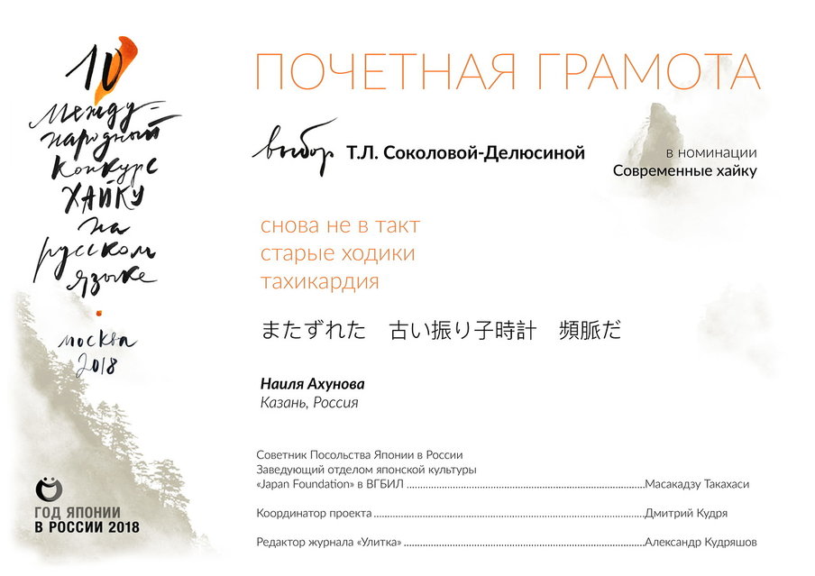 Я очень рада, что моё хайку выбрала в числе лучших в этой номинации именно Татьяна Львовна Соколова-Делюсина, член жюри, переводчик с японского.