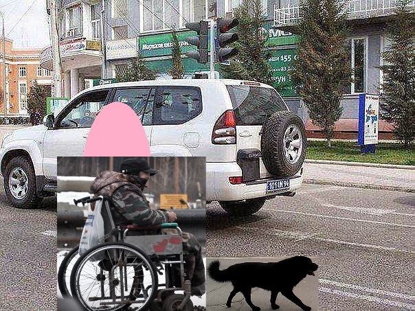(за заплаткой – коляска с инвалидом и собака)