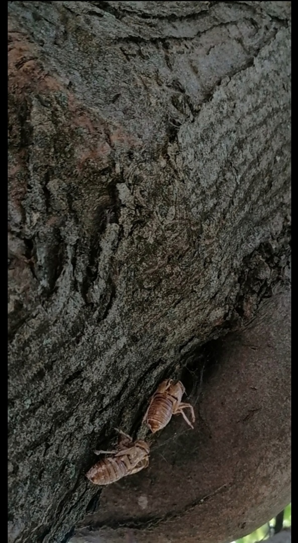 Засохшие оболочки личинок цикады. Из них вышли сформировавшиеся особи насекомых. Фото автора.