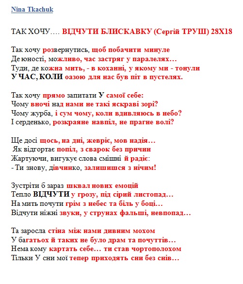 (перша "БЛИСКАВКА" українською мовою (нарешті) на вірш Ніни Ткачук (з м.Костопіль) "ТАК ХОЧУ". нижче подаю текст оригіналу та посилання на друк у ФБ)