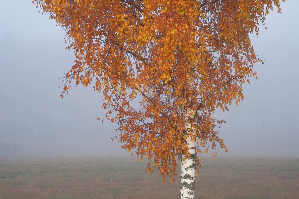 Туманом берёзка обласкана утром.