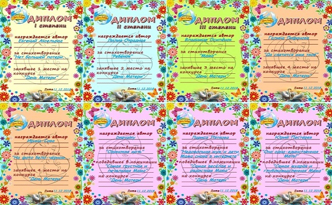 Поздравляем Евгения Аксельрода, Лилию Отрадную, Владимира Осипёнка, Ирину-Сову, Галину Лифанову 2, Ларису Пяткову, Dnevalny и Юрия Пестерева с заслуженными призовыми местами и публикуем на всеобщее обозрение копии почётных именных дипломов, которыми они награждены!