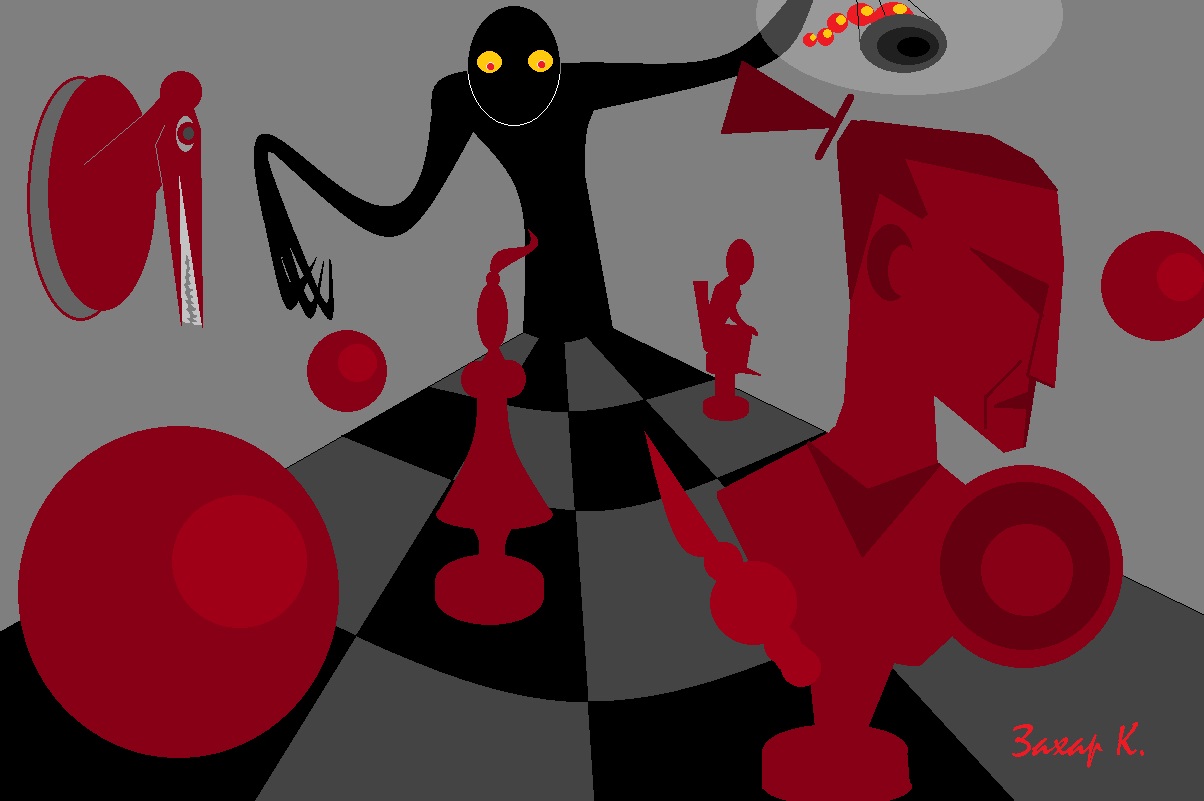Потом были песни… танцы и много крепкого алкоголя. потом опять песни… танцы и много алкоголя. Артёма полуживого притащили в кабинет Трикстера. это его кабинет. он понял по массивному… дубовому столу… который нависал и давил на пьяных вусмерть гостей… пытающихся не сползти со скользкого… кожаного дивана. за столом сидел Трикстер. он улыбался… положив своё круглое лицо на открытые ладони… вонзив острые локти в мраморную крышку постамента… называемого столом.