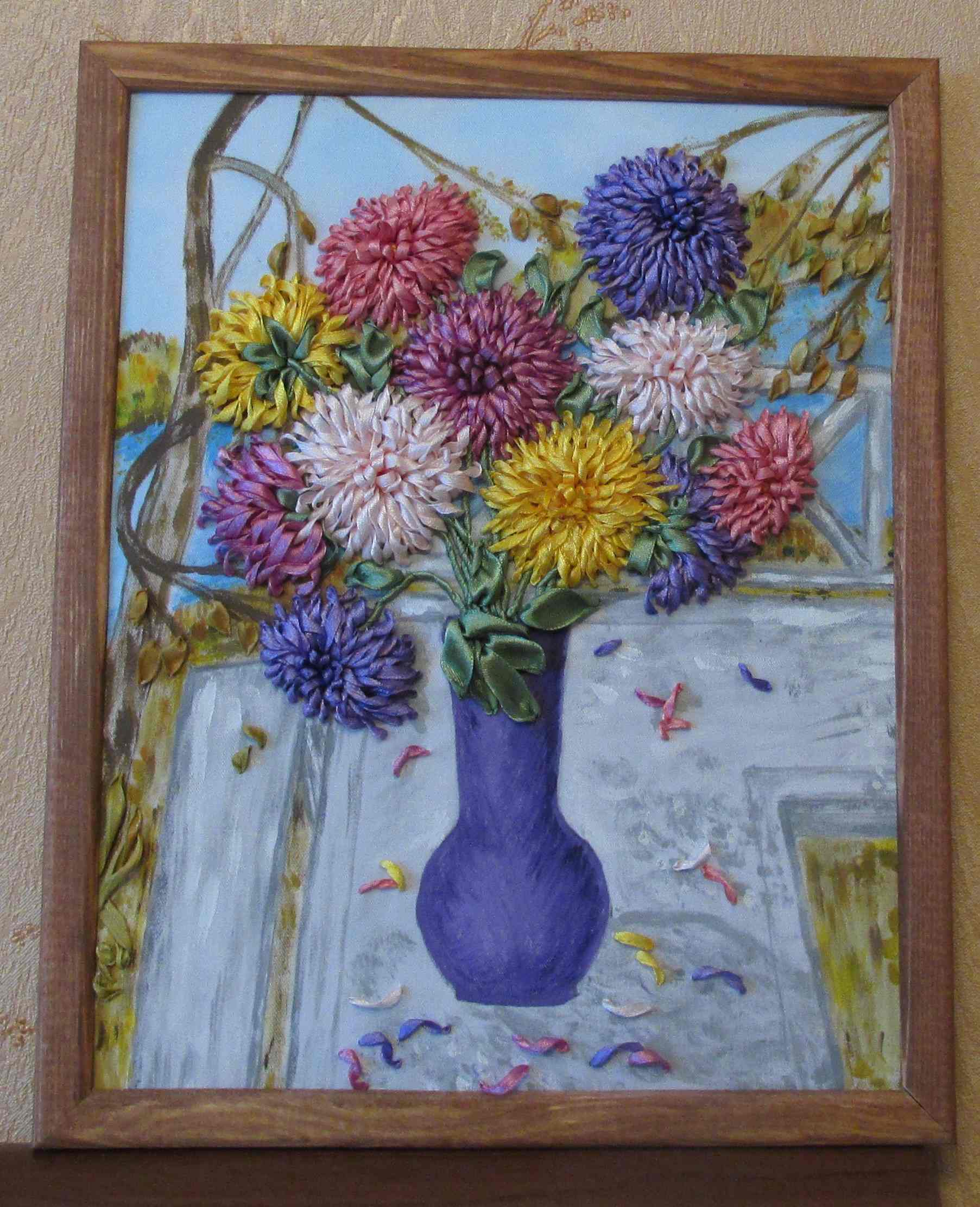 акриловыми красками, вышивка шелковыми