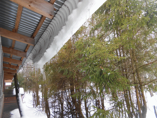 снег катится из крыши и блестит,